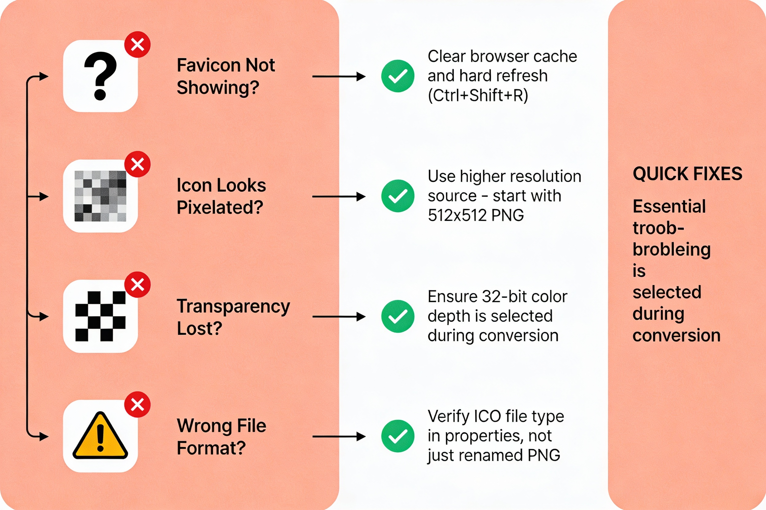 If your icon isn’t displaying after PNG to ICO conversion, several troubleshooting steps can help. First, clear your browser cache and perform a hard refresh to ensure you’re viewing the latest version of your converted file. For website favicons, verify that your PNG to ICO conversion result is placed in your website’s root directory and that your HTML includes the proper link tag pointing to the favicon.ico file. Check that your PNG to ICO conversion actually created a proper ICO file—not just a renamed PNG—by checking the file properties. If the icon looks pixelated after PNG to ICO conversion, your source PNG may have been too small; redo the PNG to ICO conversion with a higher-resolution source image. For Windows desktop icons, ensure the PNG to ICO conversion was completed correctly and that the ICO file is properly linked in your shortcut properties. These solutions typically resolve any display issues resulting from PNG to ICO conversion problems.
