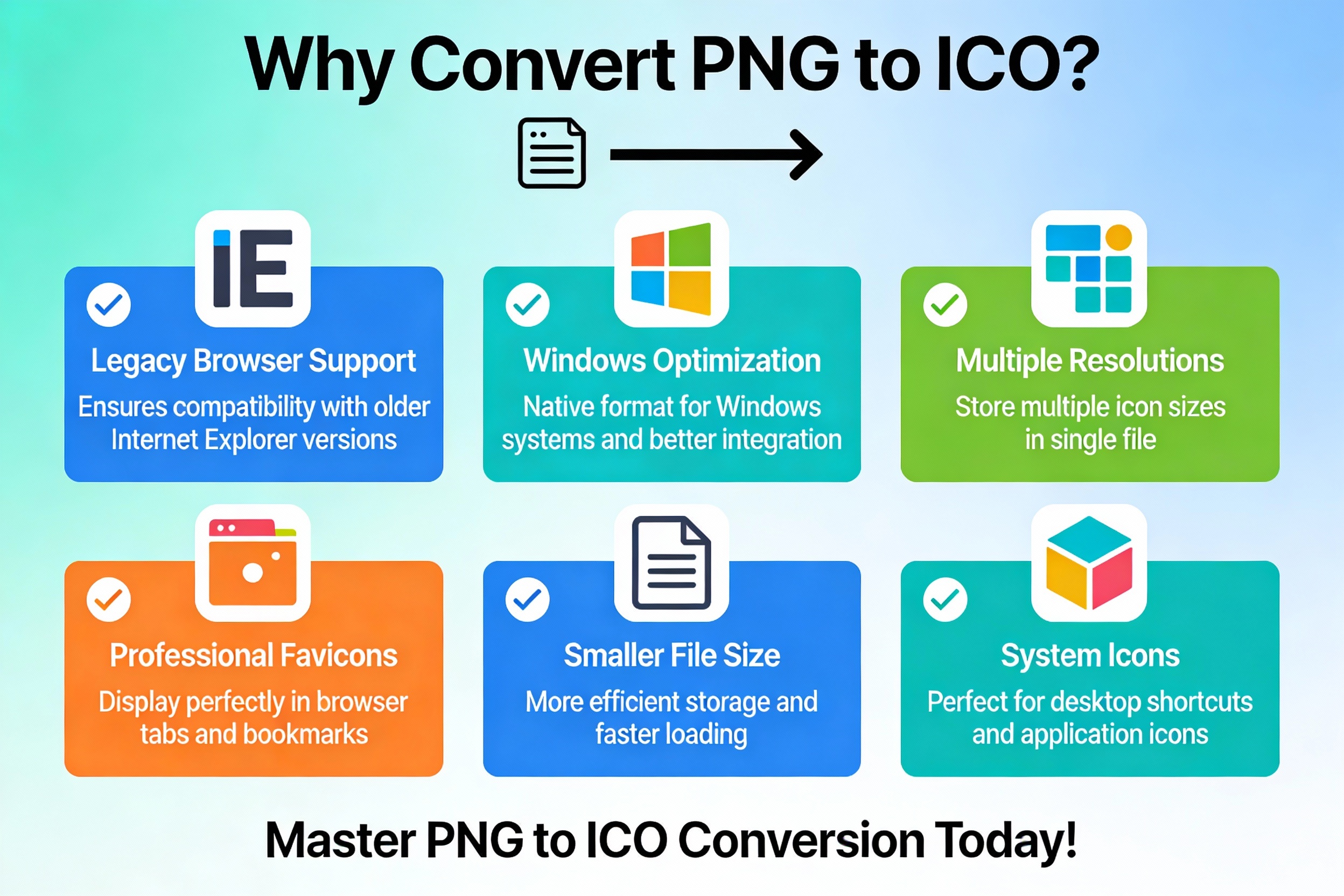 PNG to ICO conversion is the process of transforming a Portable Network Graphics (PNG) file into a Microsoft Icon (ICO) file format. This PNG to ICO conversion process is essential for web developers and designers who need to create favicons for websites or system icons for Windows applications. The main reason you should care about PNG to ICO conversion is that many older browsers and Windows systems require the ICO format for proper icon display, whereas PNG files, while excellent for web use, don’t integrate as seamlessly with Windows systems. Understanding PNG to ICO conversion helps ensure your icons display perfectly across all platforms and browsers, maintaining professional branding and user experience.