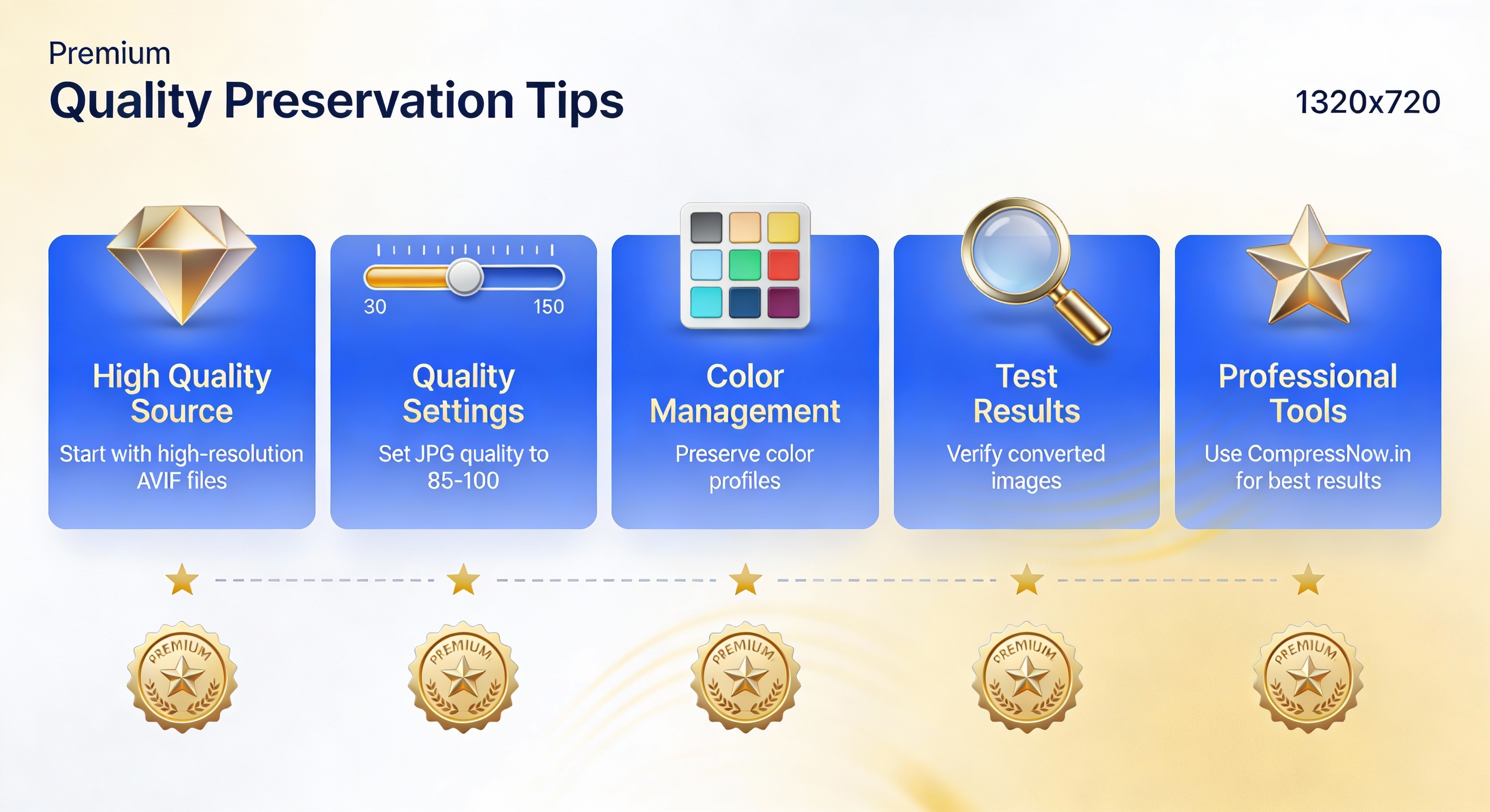 Maintaining quality when you convert AVIF to JPG requires attention to several important factors. Always start with high-resolution, high-quality AVIF source files before you attempt to convert AVIF to JPG, since the conversion process can only preserve existing quality. During the conversion, set your quality settings to 85-100 to ensure excellent results when you convert AVIF to JPG. Enable color profile preservation in your chosen converter to maintain color accuracy throughout the conversion process. Remember that AVIF supports transparency while JPG does not, so carefully select an appropriate background color for any transparent areas before you convert AVIF to JPG. After completing the conversion, always verify your results by comparing the original AVIF file with the converted JPG side-by-side. These quality-focused practices ensure your conversion produces professional results every time.