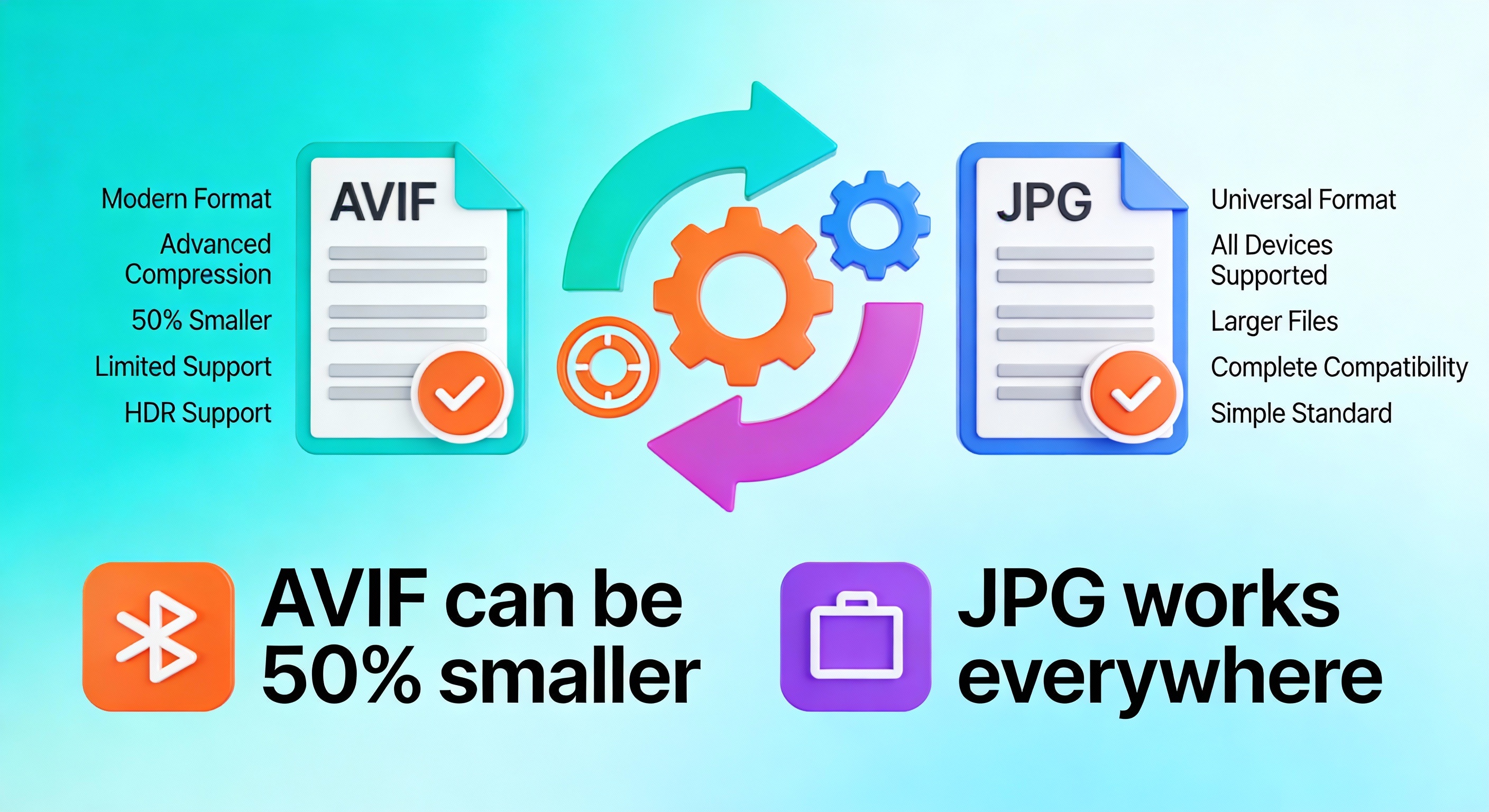 Converting AVIF to JPG is the process of transforming a modern AVIF image file into a traditional JPG format that works universally across all devices and platforms. You might need to convert AVIF to JPG for several important reasons: social media platforms may not support AVIF files yet, email clients often reject AVIF format, older devices and cameras don’t recognize AVIF, print services only accept JPG files, and many software applications haven’t added AVIF support. Understanding when to convert AVIF to JPG helps ensure your images reach the widest possible audience. The primary advantage of choosing to convert AVIF to JPG is gaining universal compatibility while maintaining good image quality.