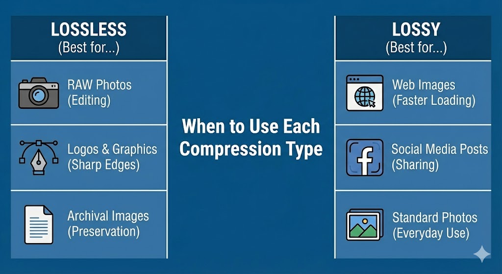 Image Quality: Lossless compression preserves perfect quality; lossy sacrifices imperceptible details for speed
